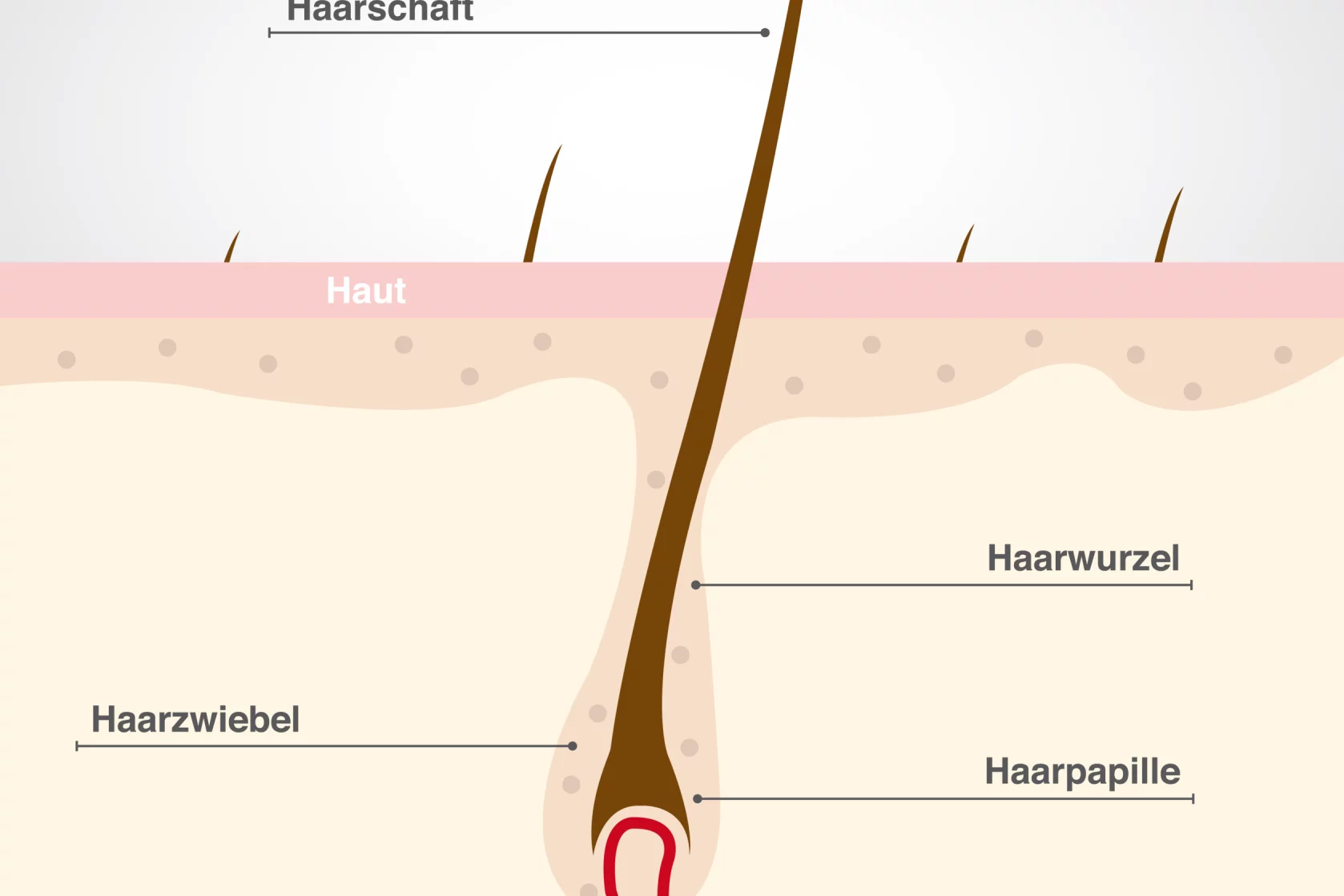 Umgeben wird die Haarwurzel zusätzlich von der inneren Wurzelscheide. Diese Zellschicht stabilisiert den Haarschaft innerhalb des Follikels und sorgt dafür, dass er sicher eingebettet bleibt, während er nach oben wächst. Sobald das Haar die Hautoberfläche erreicht, wird die innere Wurzelscheide innere Wurzelscheide jedoch nicht mehr benötigt und stößt sich nach und nach ab.